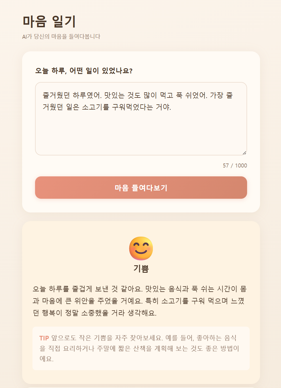 AI 공감 다이어리를 만들어 줘. 오늘 있었던 일을 한 줄로 쓰면, AI가 감정을 분석하고 공감하며 위로해 주는 일기 애플리케이션이야. backend-developer가 OpenRouter API를 연동해서 감정 분석과 공감 메시지를 생성하는 기능을 구현해 줘. llama 무료 모델을 사용하고, API 키는 현재 폴더의 ‘.env’ 파일에 저장된 것을 사용해. frontend-developer가 따뜻하고 편안한 느낌의 일기장 UI를 만든 다음, qa-engineer가 실제로 여러 상황에서 문제없이 작동하는지 테스트해 줘. 문제를 발견하면 완전히 해결할 때까지 수정하고, 최종 버전을 브라우저에서 바로 열 수 있는 ‘index.html’ 파일로 만들어 줘.